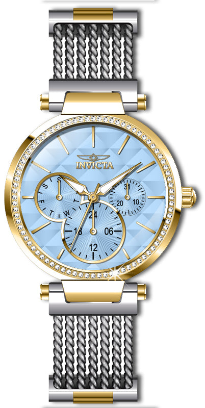 INVICTA Angel Lady 36mm Stainless Steel Gold Blue dial VH63 Quartz , Band Material: Stainless Steel,Cable, Band Tone: Steel,Gold, Band Size [mm]: 18, Band Length [mm]: 170, Buckle Type: Fold over push button , Crown Type : Push, Case Material : Stainless Steel, Case Tone : Gold, Case Size (mm) : 36, Case Back : Solid, Material of Hands : Metal, Color of Hands : Gold, Crystal Type : Flame Fusion, Bezel Material : Stainless Steel,Crystal, Dial Material : Metal, Dial Color : Blue, Dial Pattern : Textured Pattern .Purchasing these parts and having a non-authorized repair center open your watch voids all manufacturing warranties. Invicta cannot guarantee the quality standards of an altered timepiece, the standard 3-year limited warranty on Invicta timepieces shall be invalid if the timepiece is serviced at any time by an unauthorized repair center. This includes battery replacements, which must be done at an Invicta authorized repair center in order to maintain the eligibility of the warranty. Please follow the link below to learn more about Invicta's warranty.https://cdn.invictawatch.com/www/files/invicta-warranty-2018.pdf