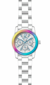 INVICTA Angel Lady 38mm Stainless Steel Iridescent + Steel Silver dial VH63 Quartz , Band Material: Stainless Steel, Band Tone: Steel, Band Size [mm]: 20, Band Length [mm]: 200, Buckle Type: Fold over safety , Crown Type : Push, Case Material : Stainless Steel, Case Tone : Iridescent,Steel, Case Size (mm) : 38, Case Back : Solid, Material of Hands : Metal, Color of Hands : Light Blue, Crystal Type : Flame Fusion, Bezel Material : Stainless Steel, Dial Material : Metal, Dial Color : Silver, Dial Pattern : Sun-ray Finish .Purchasing these parts and having a non-authorized repair center open your watch voids all manufacturing warranties. Invicta cannot guarantee the quality standards of an altered timepiece, the standard 3-year limited warranty on Invicta timepieces shall be invalid if the timepiece is serviced at any time by an unauthorized repair center. This includes battery replacements, which must be done at an Invicta authorized repair center in order to maintain the eligibility of the warranty. Please follow the link below to learn more about Invicta's warranty.https://cdn.invictawatch.com/www/files/invicta-warranty-2018.pdf