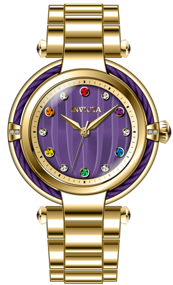 Band Material: Stainless Steel, Band Tone: Gold, Band Width: 20MM, Band Length: 210MM, Crown Type: Push, Case Material: Stainless Steel, Case Tone: Gold, Case Size [mm]: 40, Color of Hands: Gold, Crystal Type: Flame Fusion, Bezel Material: Cable, Stainless Steel, Dial Material: Metal, Dial Color: Purple .Purchasing these parts and having a non-authorized repair center open your watch voids all manufacturing warranties. Invicta cannot guarantee the quality standards of an altered timepiece, the standard 3-year limited warranty on Invicta timepieces shall be invalid if the timepiece is serviced at any time by an unauthorized repair center. This includes battery replacements, which must be done at an Invicta authorized repair center in order to maintain the eligibility of the warranty. Please follow the link below to learn more about Invicta's warranty.https://cdn.invictawatch.com/www/files/invicta-warranty-2018.pdf