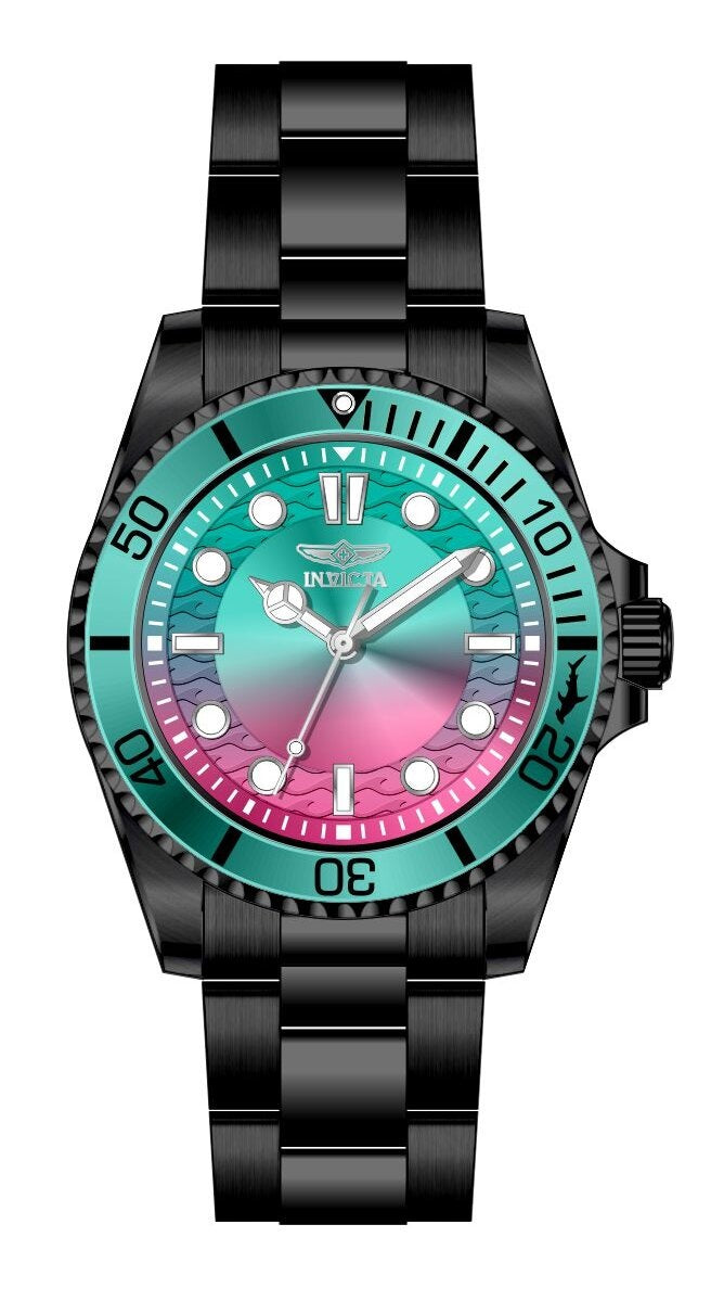 Band Material: Stainless Steel, Band Tone: Black, Band Width: 22MM, Band Length: 180MM, Crown Type: Push, Case Material: Stainless Steel, Case Tone: Black, Case Size [mm]: 43, Case Back: Solid, Material of Hands: Brass, Color of Hands: Silver,Luminous, Crystal Type: Mineral, Bezel Material: Stainless Steel,Aluminum, Dial Material: Brass, Dial Color: Pink,Light Blue,Gradient, Dial Pattern: Sun-ray Finish .Purchasing these parts and having a non-authorized repair center open your watch voids all manufacturing warranties. Invicta cannot guarantee the quality standards of an altered timepiece, the standard 3-year limited warranty on Invicta timepieces shall be invalid if the timepiece is serviced at any time by an unauthorized repair center. This includes battery replacements, which must be done at an Invicta authorized repair center in order to maintain the eligibility of the warranty. Please follow the link below to learn more about Invicta's warranty.https://cdn.invictawatch.com/www/files/invicta-warranty-2018.pdf