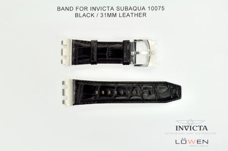 Band For Men Invicta Subaqua 10075, Band Material Leather, Band Color Black, Band Width 31X24 MM, Band Length 220 MM, Buckle Type Regular, Clasp Type Foldover, Buckle. Please note that bands do not ship with T bars. If you need these parts, please add them to your cart with the corresponding part sku.