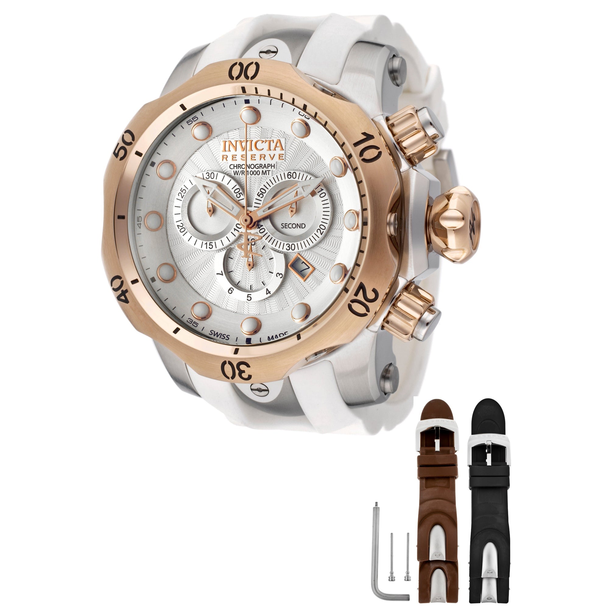 Individual Spare PARTS For Men Invicta Venom 11159, Band Material Stainless Steel, Polyurethane, Band Color Steel, White, Brown, Black. Band Width 26 MM, Band Length 210 MM, Buckle Type Regular, Clasp Type Foldover, Buckle, Crown Type Screw Down, Case Material Stainless Steel, Case Tone Rose Gold, Steel, Case Size (mm) 53.7, Case Back Solid, Material of Hands Metal, Color of Hands Rose Gold, Luminous, Crystal Type Flame Fusion, Bezel Material Stainless Steel, Dial Material Metal, Dial Color Silver, Dial Pattern 0Purchasing these parts and having a non-authorized repair center open your watch voids all manufacturing warranties. Invicta cannot guarantee the quality standards of an altered timepiece, the standard 3-year limited warranty on Invicta timepieces shall be invalid if the timepiece is serviced at any time by an unauthorized repair center. This includes battery replacements, which must be done at an Invicta authorized repair center in order to maintain the eligibility of the warranty. Please follow the link below to learn more about Invicta's warranty.https://cdn.invictawatch.com/www/files/invicta-warranty-2018.pdf