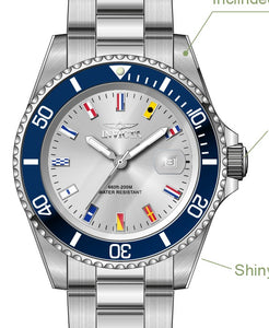 Band Material: Stainless Steel, Band Tone: Steel, Band Width: 20MM, Band Length: 205MM, Crown Type: Push, Case Material: Stainless Steel, Case Tone: Steel, Case Size [mm]: 40, Case Back: Solid, Material of Hands: Metal, Color of Hands: Silver, Crystal Type: Mineral, Bezel Material: Stainless Steel, Dial Material: Metal, Dial Color: Silver, Dial Pattern: Sun-ray Finish .Purchasing these parts and having a non-authorized repair center open your watch voids all manufacturing warranties. Invicta cannot guarantee the quality standards of an altered timepiece, the standard 3-year limited warranty on Invicta timepieces shall be invalid if the timepiece is serviced at any time by an unauthorized repair center. This includes battery replacements, which must be done at an Invicta authorized repair center in order to maintain the eligibility of the warranty. Please follow the link below to learn more about Invicta's warranty.https://cdn.invictawatch.com/www/files/invicta-warranty-2018.pdf