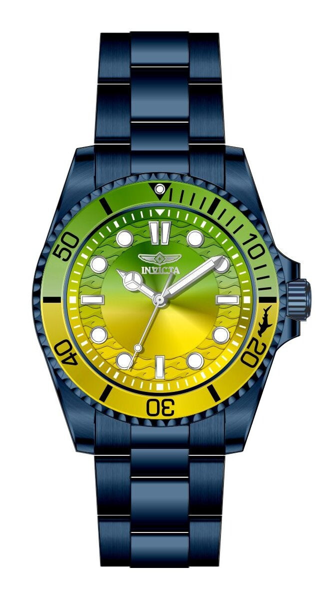 Band Material: Stainless Steel, Band Tone: Blue, Band Width: 22MM, Band Length: 180MM, Crown Type: Push, Case Material: Stainless Steel, Case Tone: Blue, Case Size [mm]: 43, Case Back: Solid, Material of Hands: Brass, Color of Hands: Silver,Luminous, Crystal Type: Mineral, Bezel Material: Stainless Steel,Aluminum, Dial Material: Brass, Dial Color: Yellow,Green,Gradient, Dial Pattern: Sun-ray Finish .Purchasing these parts and having a non-authorized repair center open your watch voids all manufacturing warranties. Invicta cannot guarantee the quality standards of an altered timepiece, the standard 3-year limited warranty on Invicta timepieces shall be invalid if the timepiece is serviced at any time by an unauthorized repair center. This includes battery replacements, which must be done at an Invicta authorized repair center in order to maintain the eligibility of the warranty. Please follow the link below to learn more about Invicta's warranty.https://cdn.invictawatch.com/www/files/invicta-warranty-2018.pdf