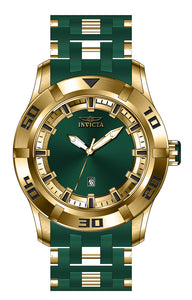 Band Material: Stainless Steel,Polyurethane, Band Tone: Gold,Green, Band Width: 26MM, Band Length: 190MM, Crown Type: Push, Case Material: Stainless Steel, Case Tone: Gold, Case Size [mm]: 50, Case Back: Solid, Material of Hands: Metal, Color of Hands: Gold, Crystal Type: Flame Fusion, Bezel Material: Stainless Steel, Dial Material: Metal, Dial Color: Green .Purchasing these parts and having a non-authorized repair center open your watch voids all manufacturing warranties. Invicta cannot guarantee the quality standards of an altered timepiece, the standard 3-year limited warranty on Invicta timepieces shall be invalid if the timepiece is serviced at any time by an unauthorized repair center. This includes battery replacements, which must be done at an Invicta authorized repair center in order to maintain the eligibility of the warranty. Please follow the link below to learn more about Invicta's warranty.https://cdn.invictawatch.com/www/files/invicta-warranty-2018.pdf